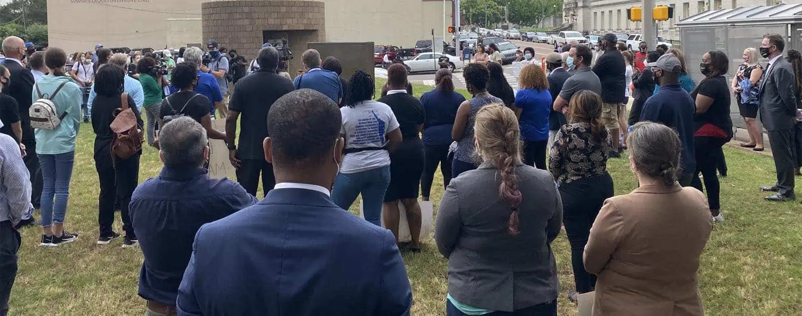 They gathered outside the Walter L. Bailey Criminal Justice Center at 201 Poplar at 8:46 a.m., a time chosen to note the amount of time a Minneapolis police officer knelt on the neck of George Floyd before he died.